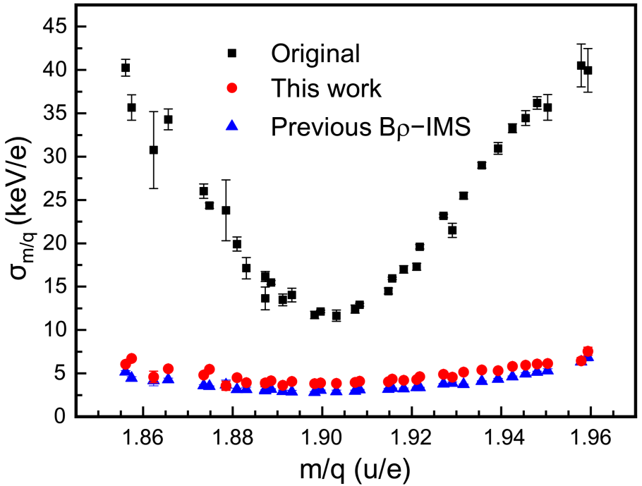 圖:本方法(紅點(diǎn))與之前Bρ-IMS(藍(lán)點(diǎn))給出的質(zhì)荷比(m/q)標(biāo)準(zhǔn)差的對(duì)比。黑點(diǎn)為傳統(tǒng)等時(shí)性質(zhì)譜術(shù)(未進(jìn)行磁場(chǎng)修正)的結(jié)果
